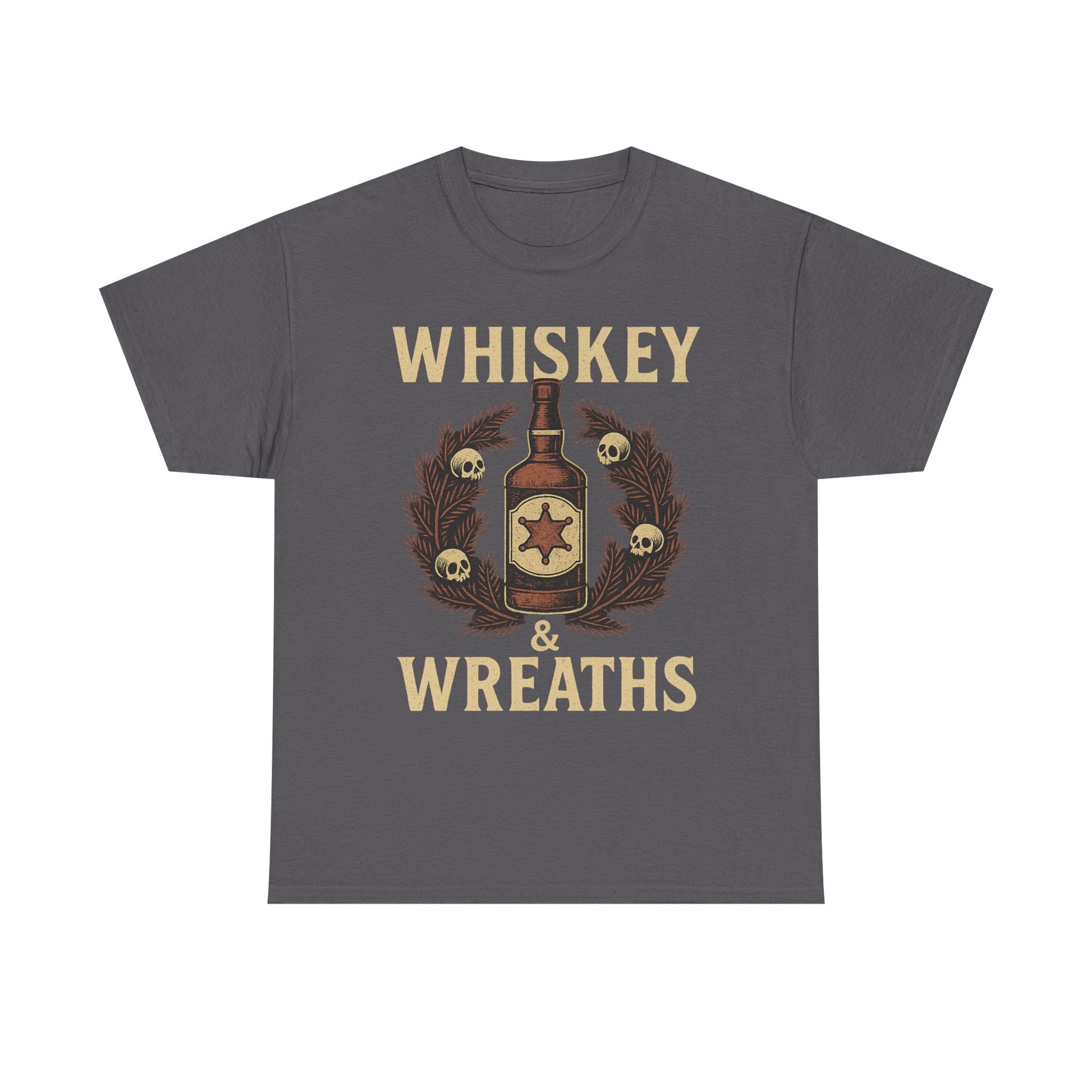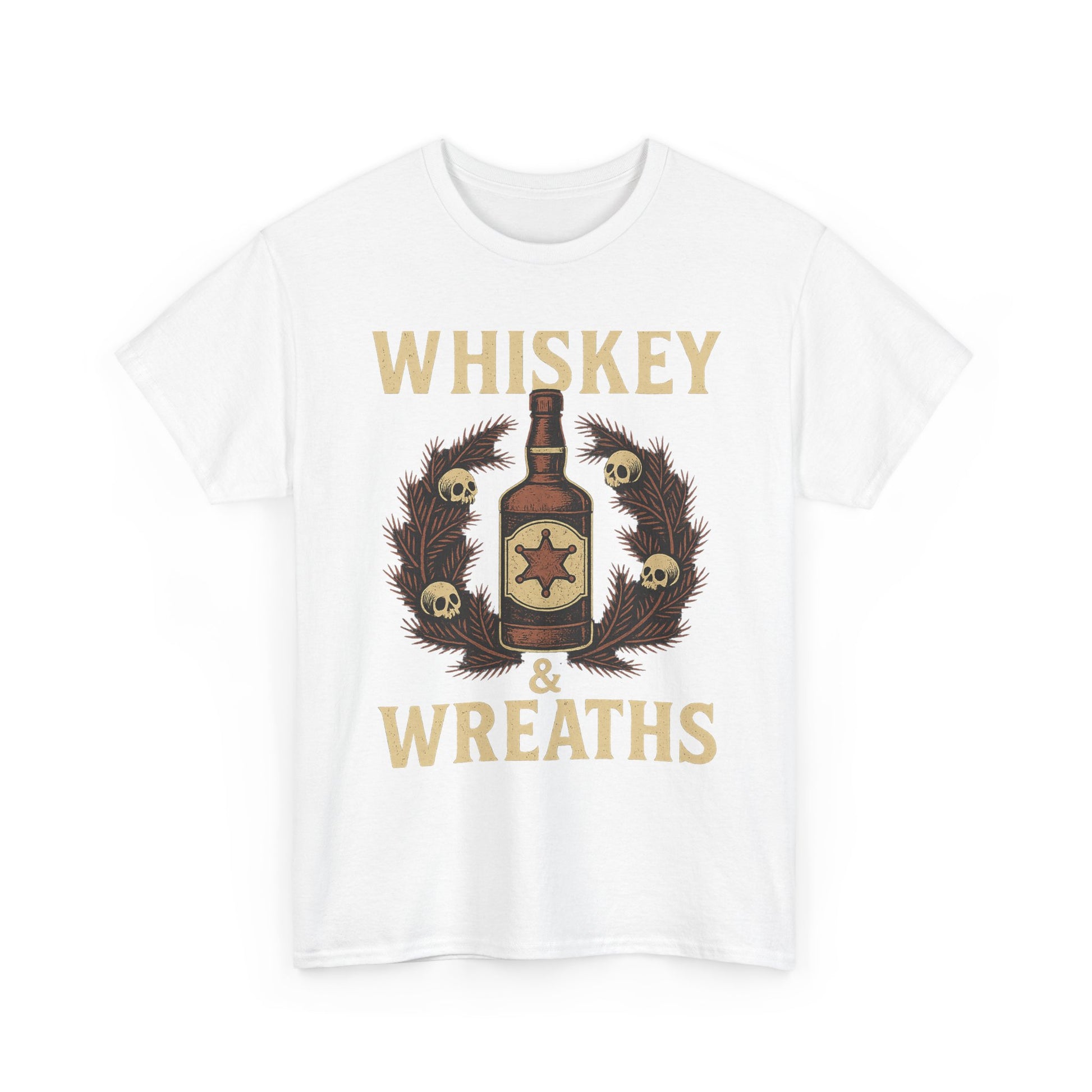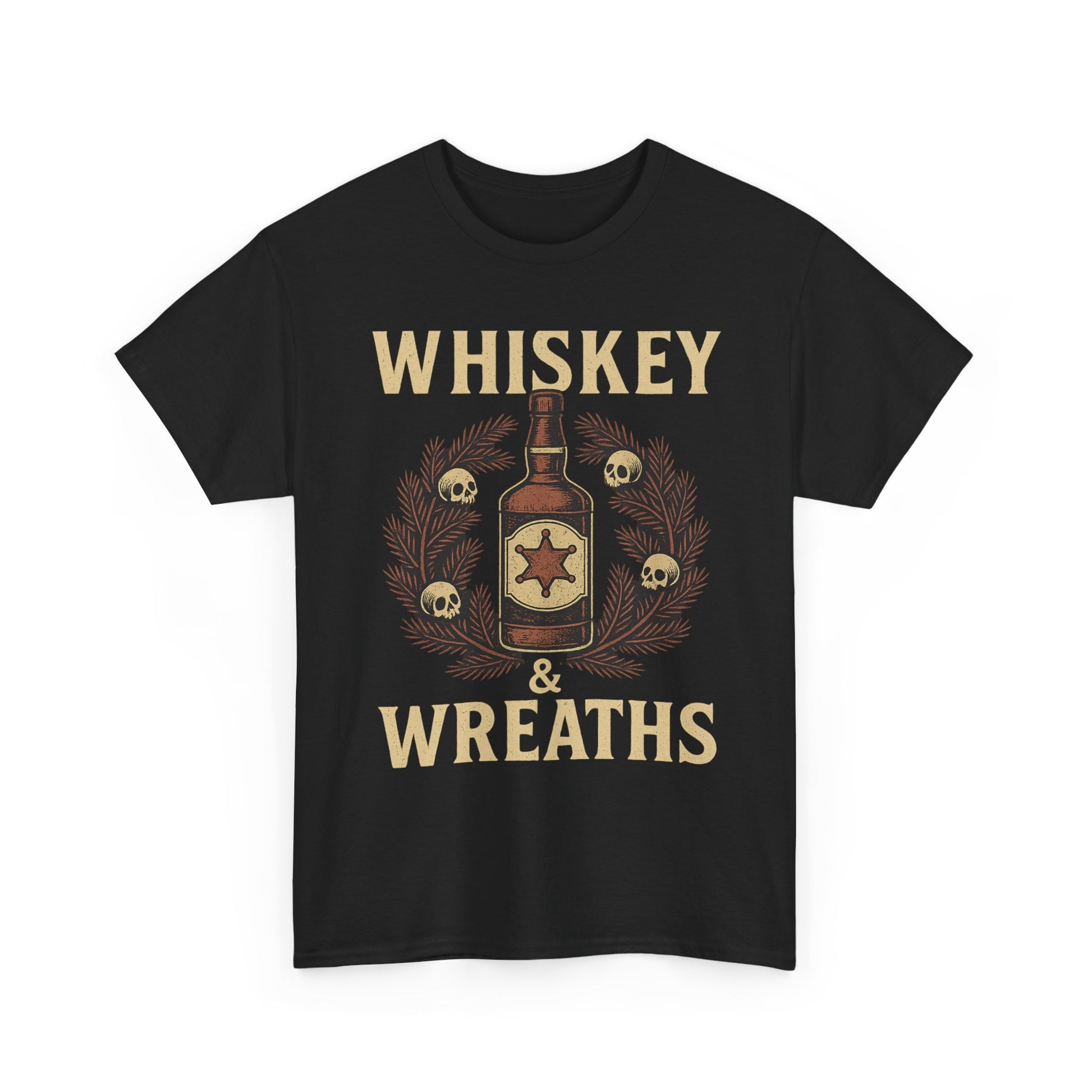 The *Whiskey & Wreaths* tee blends vintage Western grit with outlaw holiday charm. A weathered whiskey bottle wrapped in a skull-decorated wreath, bold lettering, and the kind of festive mood that pairs best with a smoky shot of rebellion.