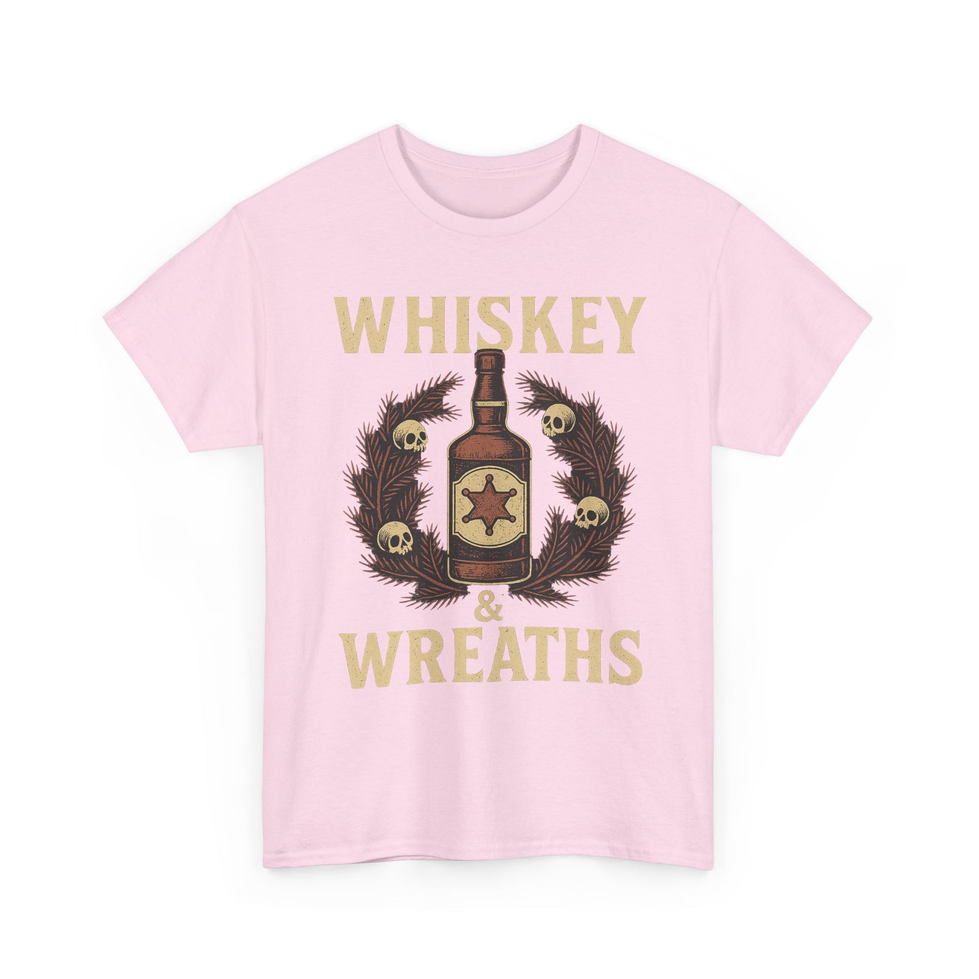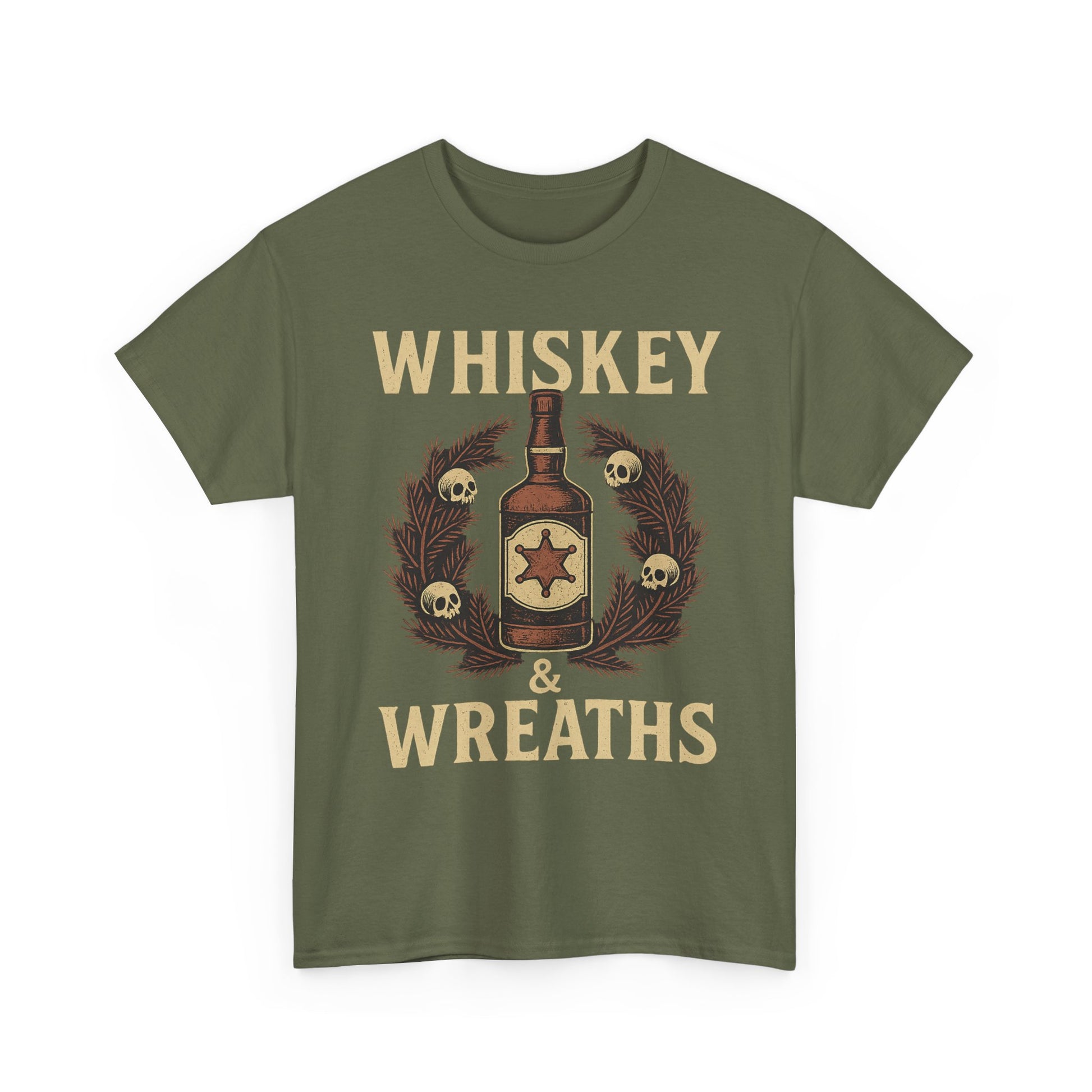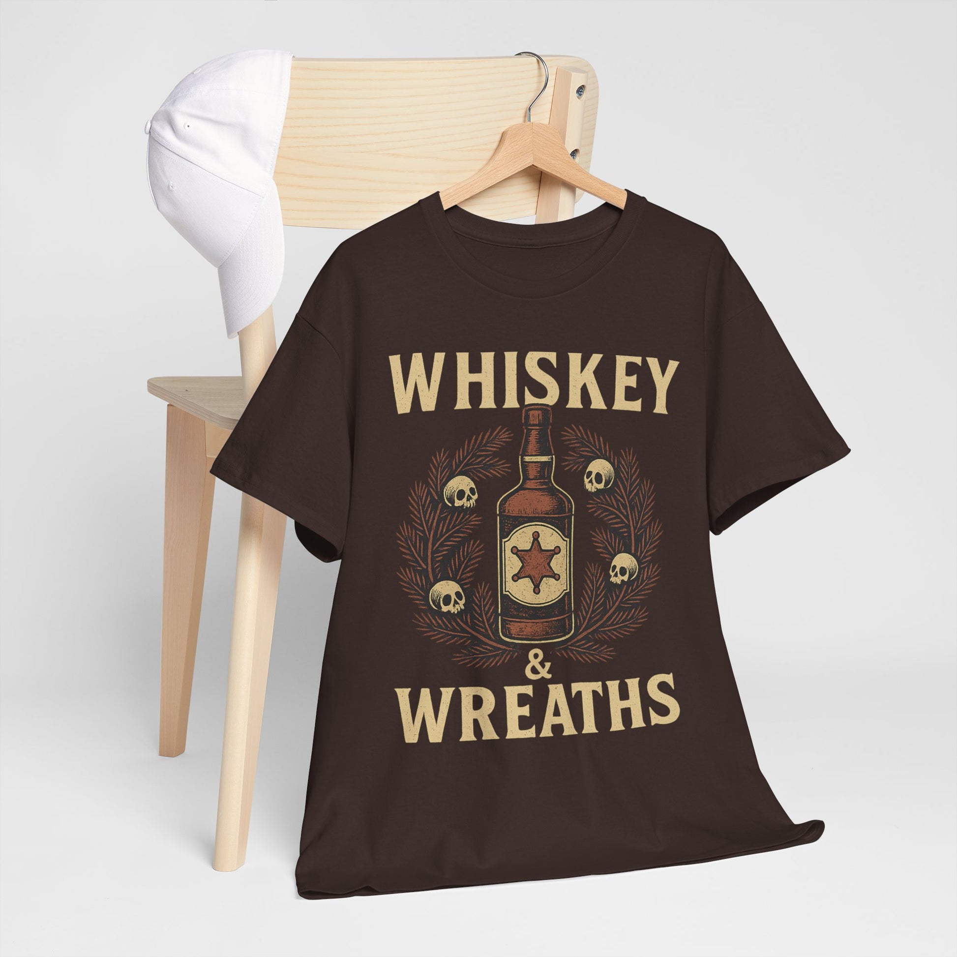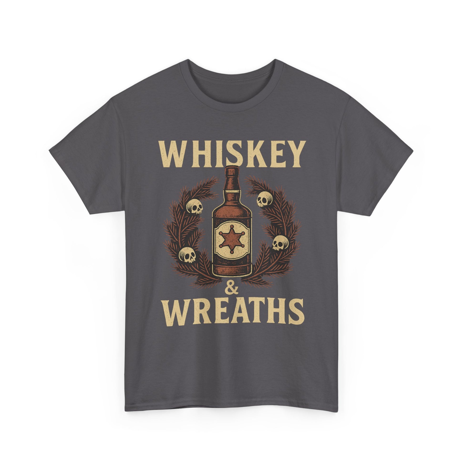 The *Whiskey & Wreaths* tee blends vintage Western grit with outlaw holiday charm. A weathered whiskey bottle wrapped in a skull-decorated wreath, bold lettering, and the kind of festive mood that pairs best with a smoky shot of rebellion.